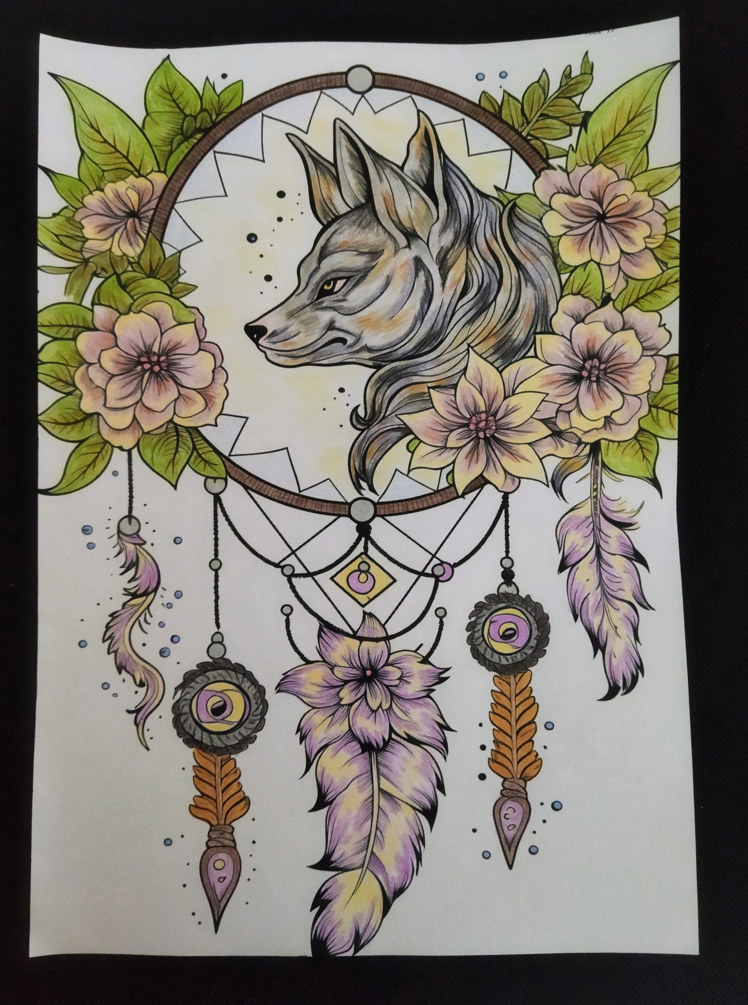 Retrouvez toute l'originalité de ce joli attrape rêves, illustré par un loup au regard féroce et encadré de fleurs aux couleurs pastel, source de détente.