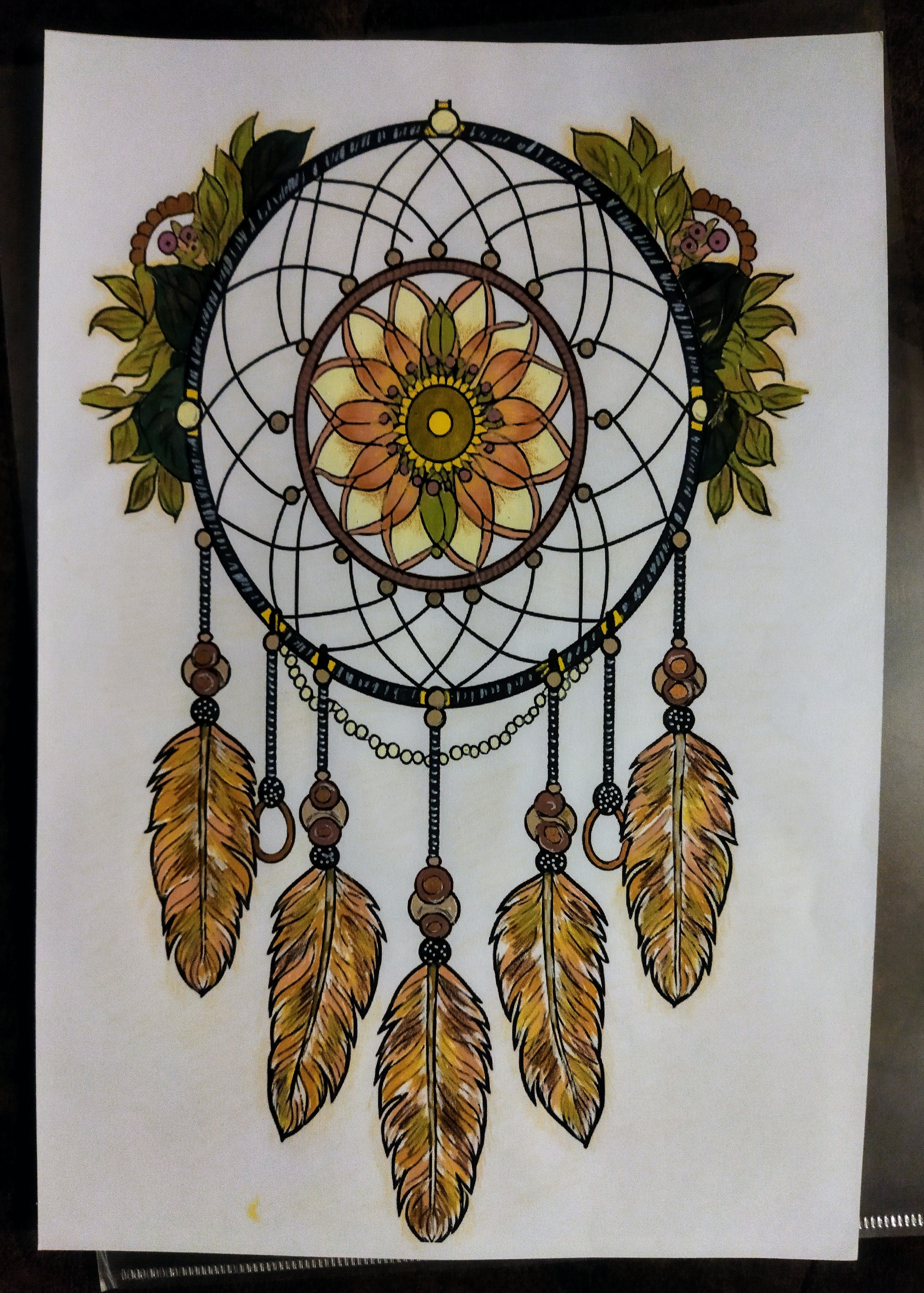 Couleurs chaleureuses pour ce joli attrape rêves, réalisé aux crayons de couleurs spécial pro à la mine huileuse et aux feutres pour un rendu artistique et un effet peinture créatif.