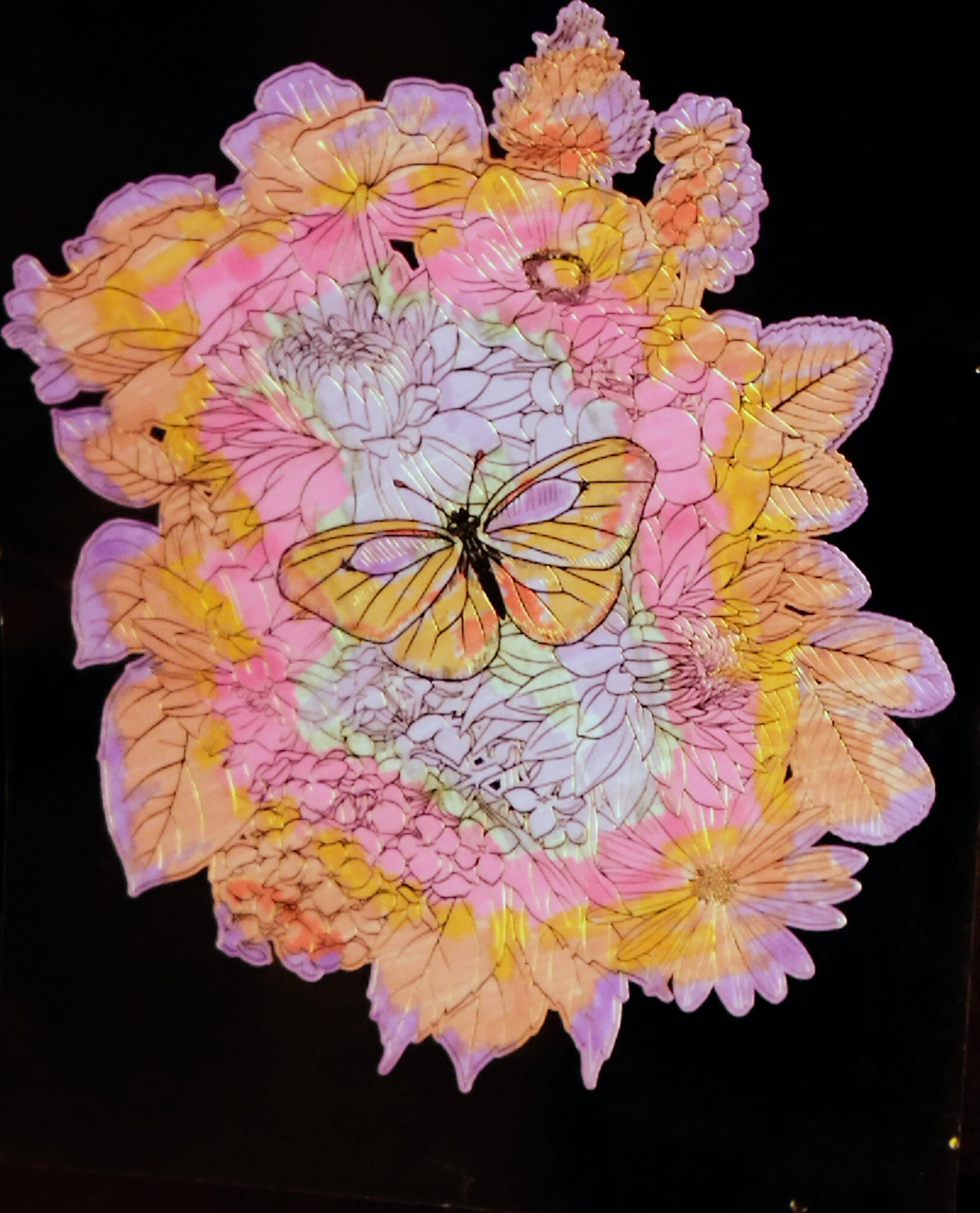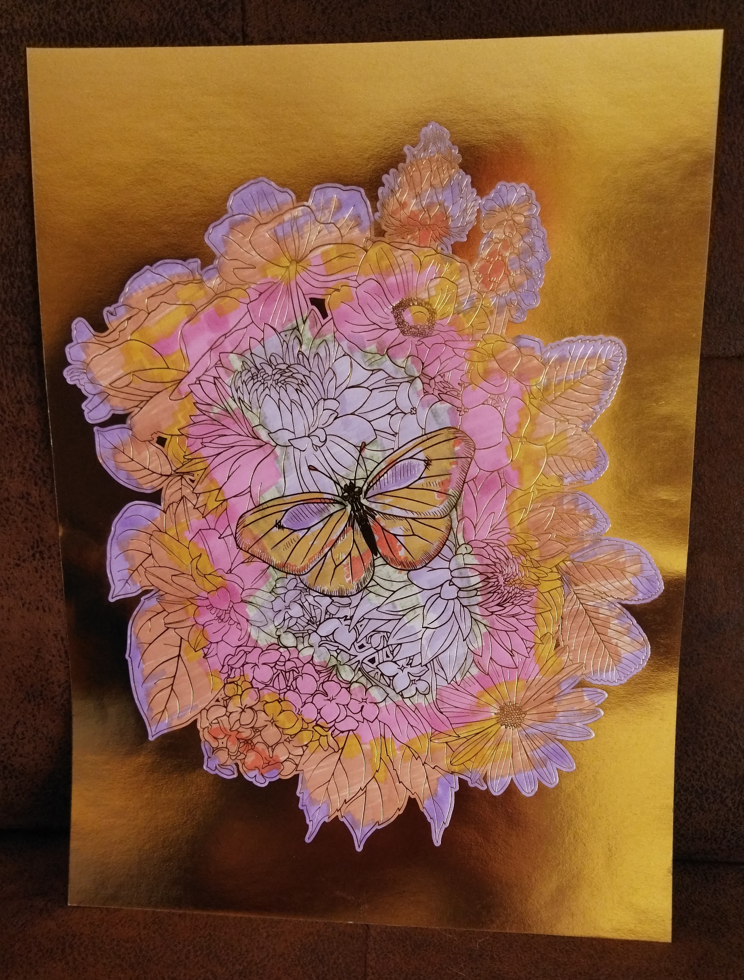 Celle ci représente un papillon dans un milieu floral aux couleurs lumineuses et variées.