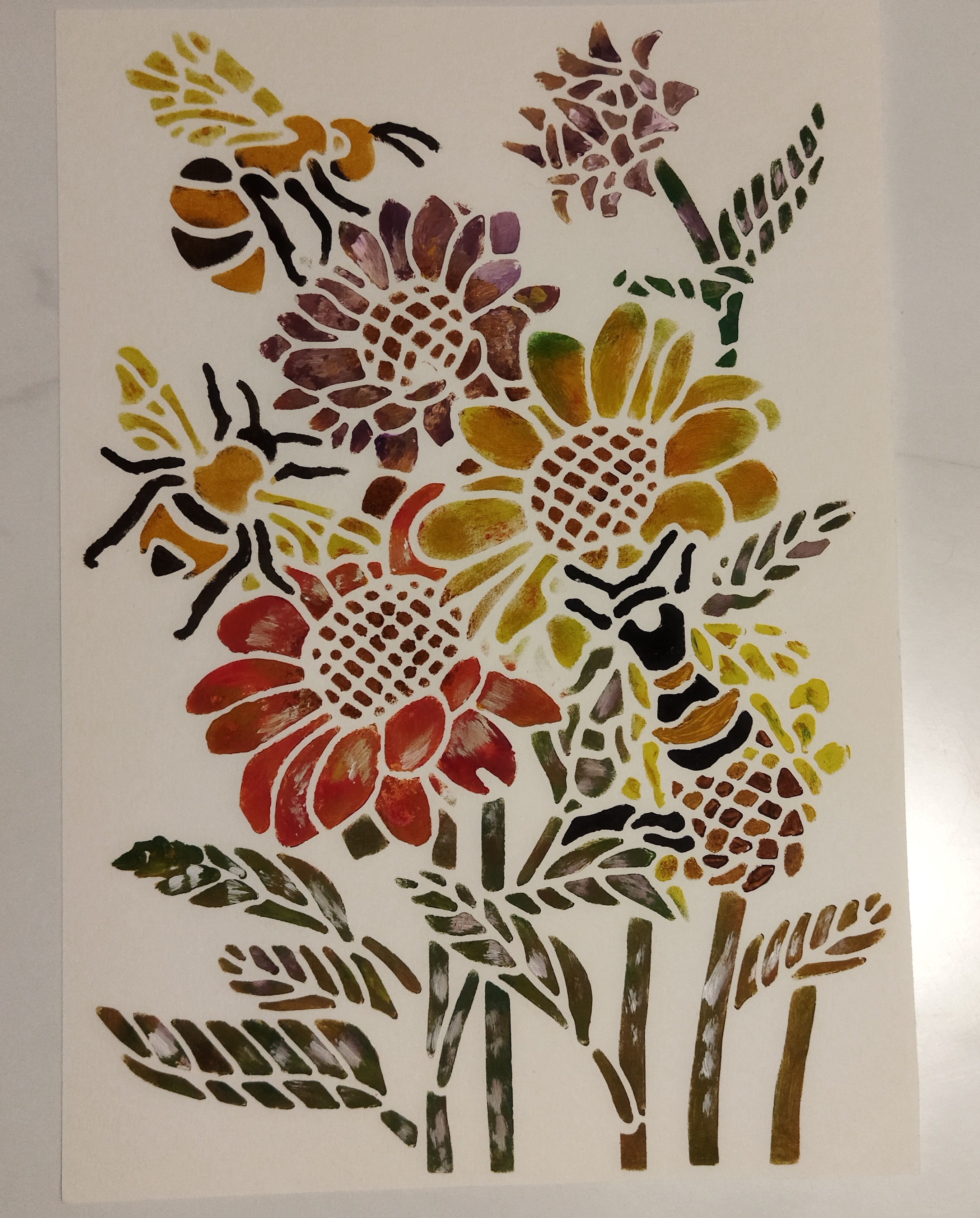 Réalisé à la peinture gouache avec un pochoir, pour un rendu artistique et créatif.