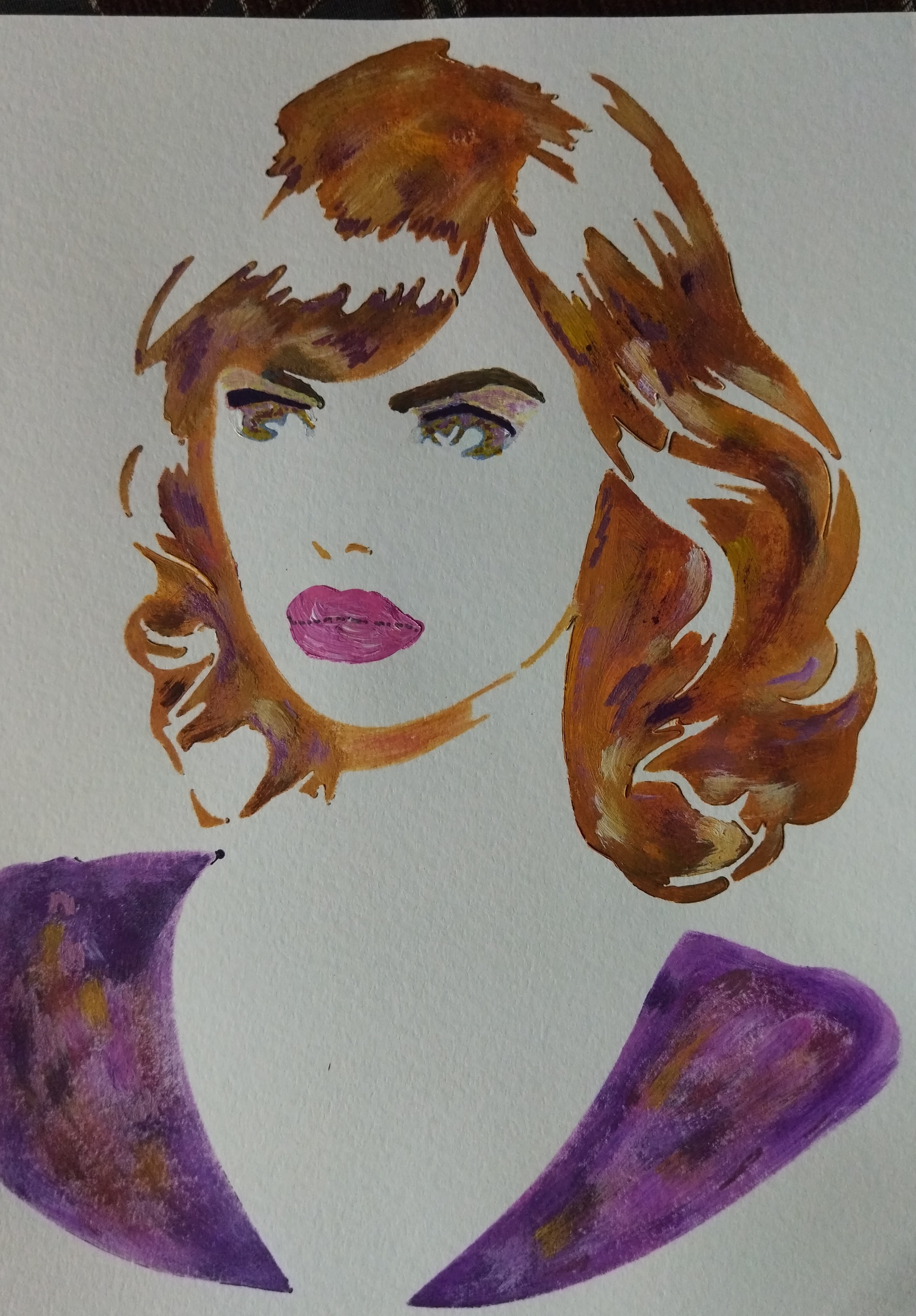 Couleurs lumineuses et variées pour ce joli visage de femme à la chevelure châtain, vêtue de violet.