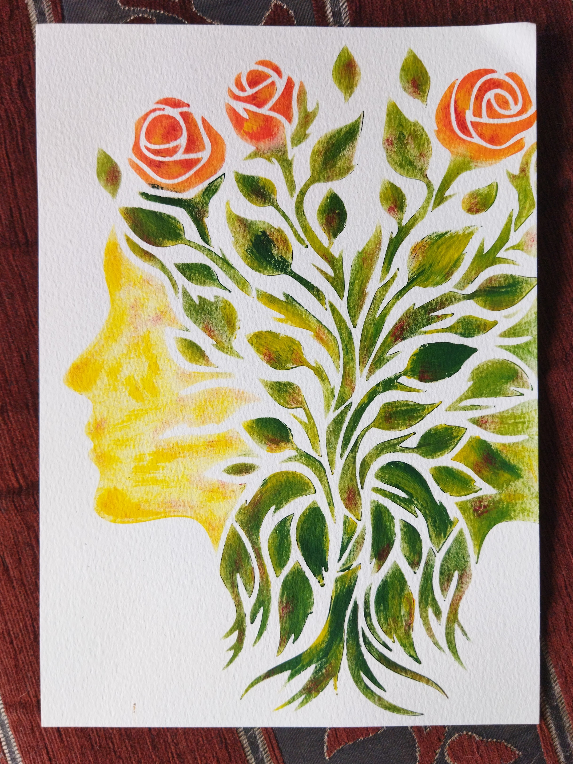 Joli profil d'un visage de femme, encadré d'un feuillage vert nuancé et de roses rouges.