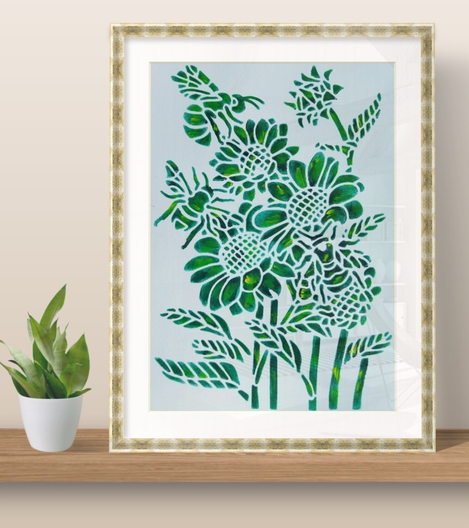 Décorez vos murs d'originalité artistique et atypique, avec ce joli dessin illustré par des abeilles qui butinent des marguerites, à la couleur turquoise nuancée.