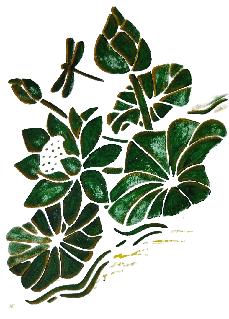 Ce dessin pochoir met en lumière des nénuphars vert nuancé, peints à la gouache, aux formes découpées et graphiques. Les verts profonds, subtilement ombrés de touches plus sombres et de reflets chauds, évoquent la végétation aquatique et la sérénité d’un bassin naturel.