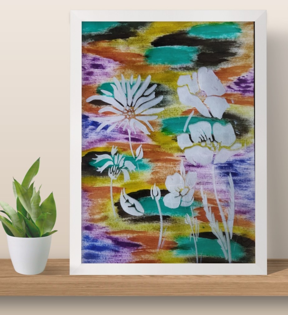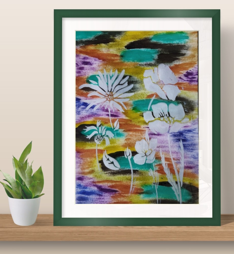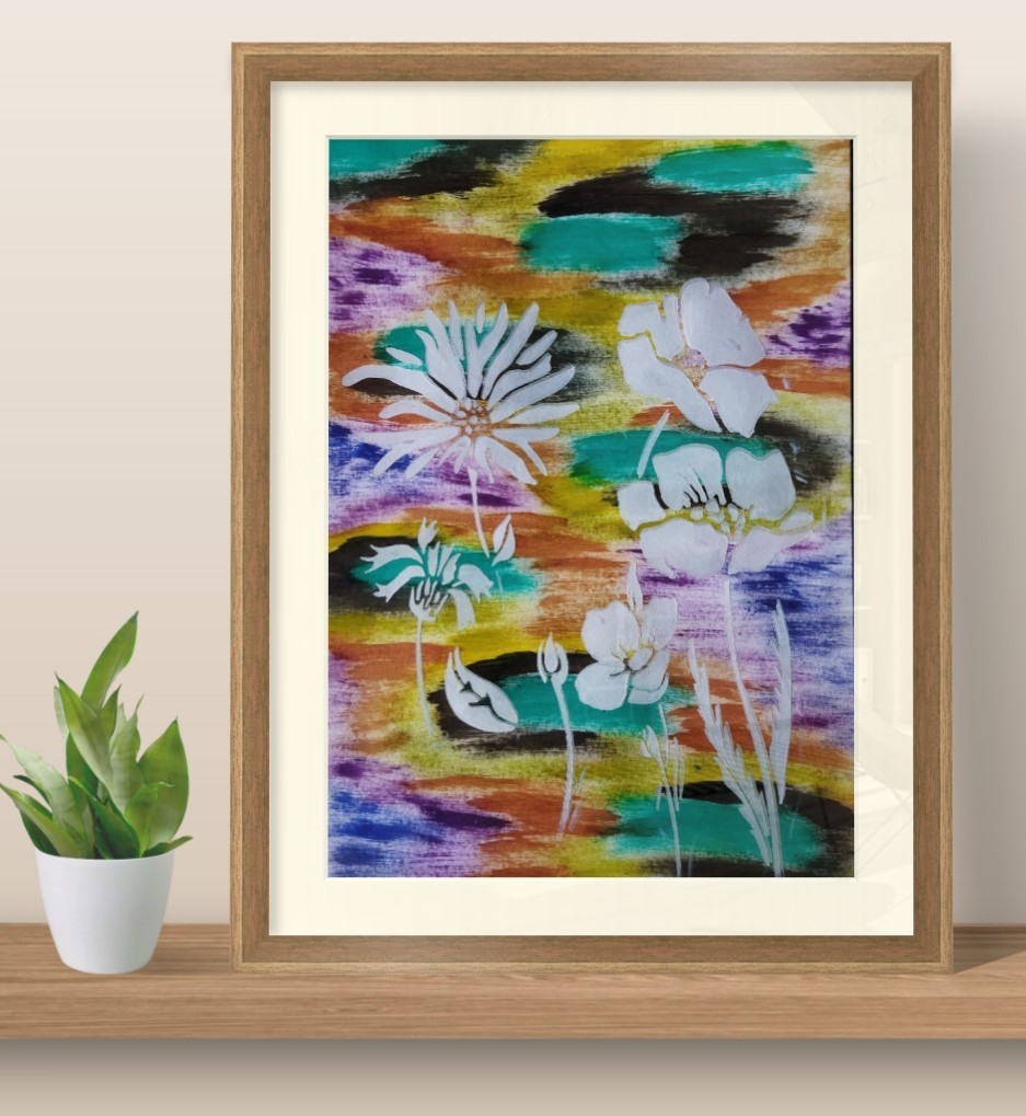 Ce dessin décoratif met en scène de fleurs blanches réalisées au pochoir, qui se détachent avec élégance sur un fond multicolore vibrant, peint à la gouache et à l’aquarelle.
