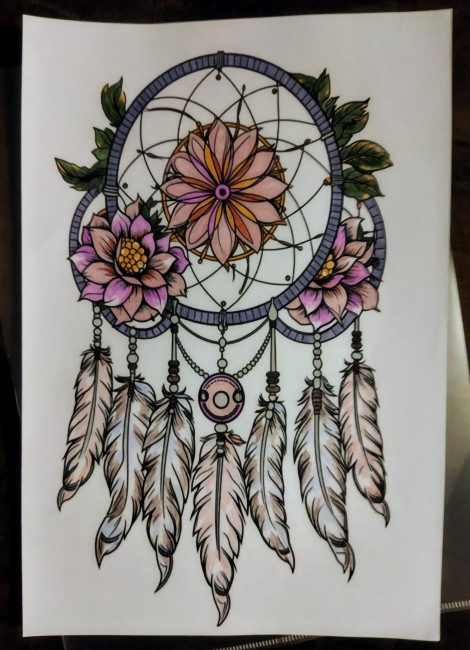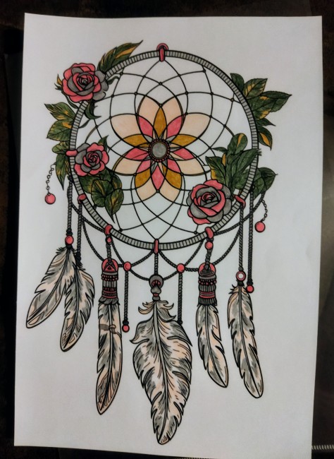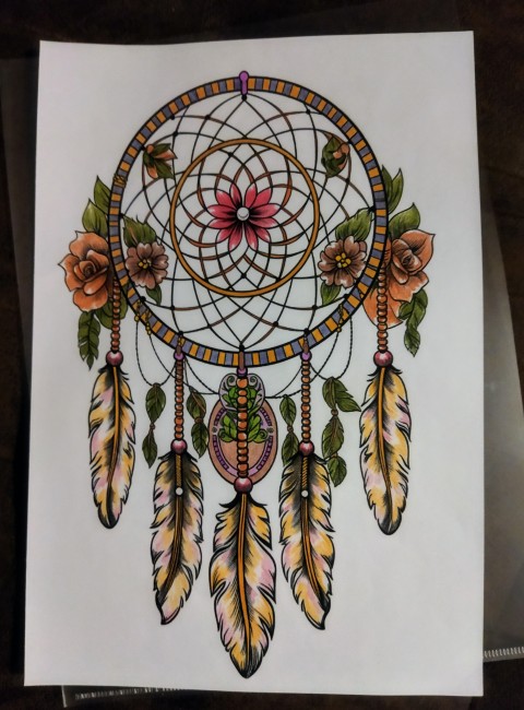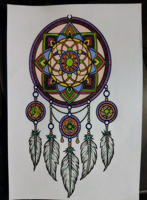 Dessin coloriage attrape rêves fleurs, plumes, rouge, vert et jaune