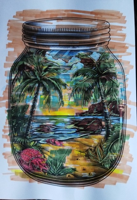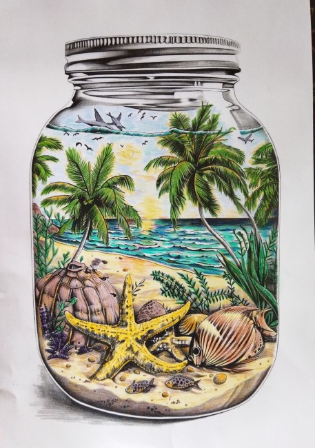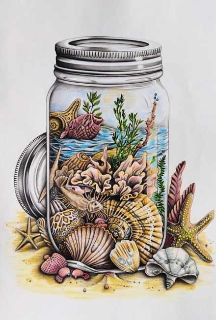 Dessin coquillages au bord de la mer dans un bocal en verre