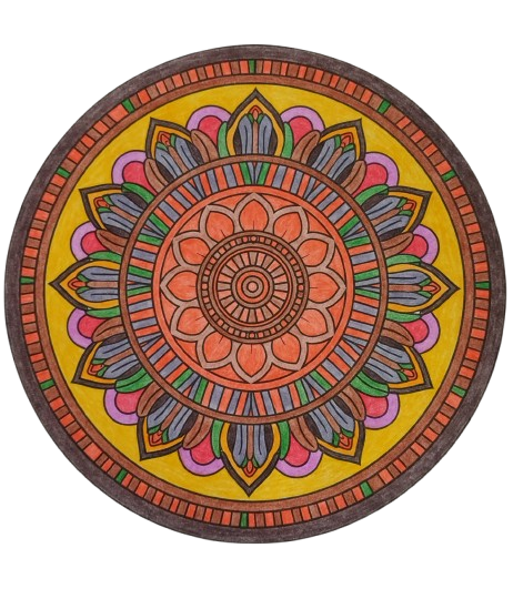 Dessin mandala colorié rond, couleurs chaleureuses multiples